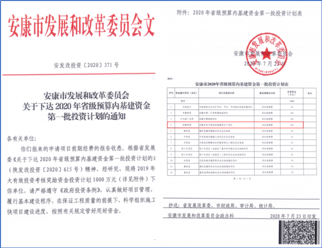 近月,安康市发展和改革委员会发布了《安康市发展和改革委员会关于下达2020年省级预算内基建资金第一批投资计划的通知》(安发改投资〔2020〕371号),欧冠投注官网入口组织申报的“安康市电子商务发展中心”平台项目成功获批,获得建设资金100万元。