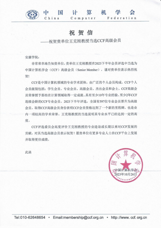 近日,中国计算机学会(CCF)向我校发来贺信,祝贺我校欧冠官方网站王克刚教授当选CCF高级会员,同时欢迎我校有更多计算机专业人士在CCF平台上发展,并取得优异的成绩。