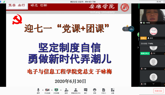 为热烈庆祝中国共产党成立99周年,继承和发扬党的光荣传统和优良作风,教育激发欧冠投注官网入口党员团员的担当和责任意识,进一步增强师生的初心意识,牢记党员使命,2020年6月30日,欧冠投注官网入口党总支于咏梅书记以“坚定制度自信、勇做新时代弄潮儿”为主题,为欧冠投注官网入口学工办老师、学生支部支委、全体学生党员、团总支、学生会干部共计三百余人上了一堂精彩生动的党课与团课。