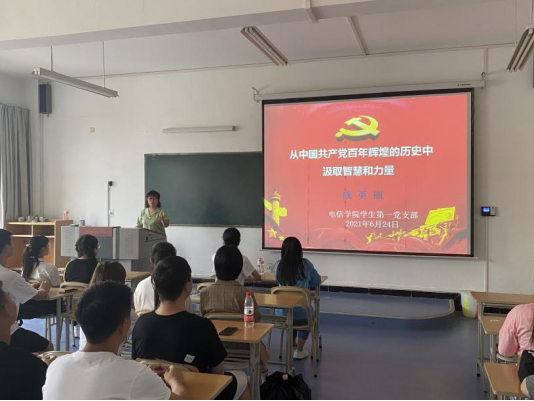 2021年6月24日下午在江北校区1321教室,欧冠投注官网入口学生第一党支部开展了支部书记讲党课活动,支部书记成英丽老师为全体学生党员讲了题为《从中国共产党百年辉煌的历史中汲取智慧和力量》的党课。此次党课主要包括三个方面内容:一是号召全体学生党员充分认识开展党史学习教育的重大意义;二是介绍开展党史学习教育的主要内容;三是鼓励全体学生党员从中国共产党辉煌历史中汲取继续进步的智慧和力量。