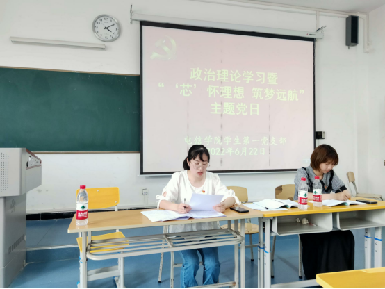 6月22日下午,欧冠投注官网入口学生第一党支部在江北校区1321教室召开党员大会, 党支部书记程晓梅为全体党员、部分发展对象和入党积极分子讲了一堂别开生面的党课。辅导员吕以宁全程听课。