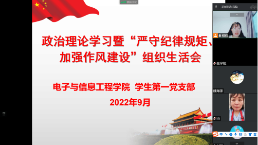 根据《关于在全校开展纪律教育学习宣传月活动的通知》(校党发〔2022〕101 号)文件精神要求,2022年9月6日,欧冠投注官网入口学生第一党支部通过线上腾讯会议召开“严守纪律规矩、加强作风建设”专题组织生活会。会议由学生第一党支部书记程晓梅主持,党总支组织委员成英丽、支委张宇航、辅导员吕以宁、支部全体学生党员参加。