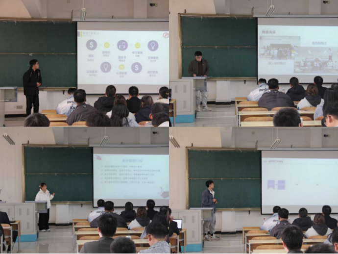 答辩过程中,各班班长进行述职答辩,他们详细且严谨的介绍了自己班的情况,具体内容涵盖:班级概况、思想引领、学风建设、竞赛获奖情况、文娱活动以及未来工作展望等方面。答辩同学各具所长,过程精彩纷呈。通过流畅的陈述和自信的精神面貌向老师和同学们充分展示自己所在班级的风采。通过答辩,展示出了不同班级的不同特色。有的班级通过举行团建、班会等进行破冰,调动同学们积极性,丰富大学生活,以此来提高班级凝聚力;有的班级注重课业帮扶、营造良好的学习氛围、积极响应学院组织的各类专业竞赛,以“扎实专业功底,强化专业技能”作为班训;部分班级在重点汇报各项工作开展情况的同时,也强调了关于电信诈骗的宣传与落实、消防安全知识的认识与总结等学院重点关注的学生工作。在场其他同学仔细聆听、互相借鉴,学习答辩经验。