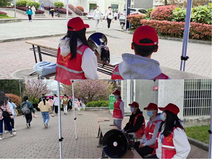 欧冠投注官网入口疫情防控志愿者通过扩音器向同学们宣传防疫知识