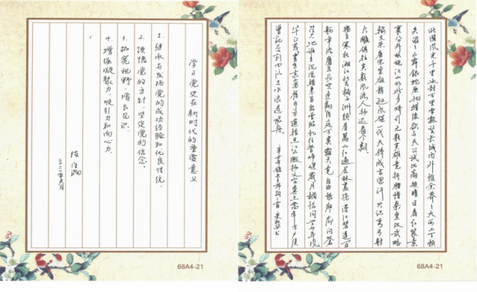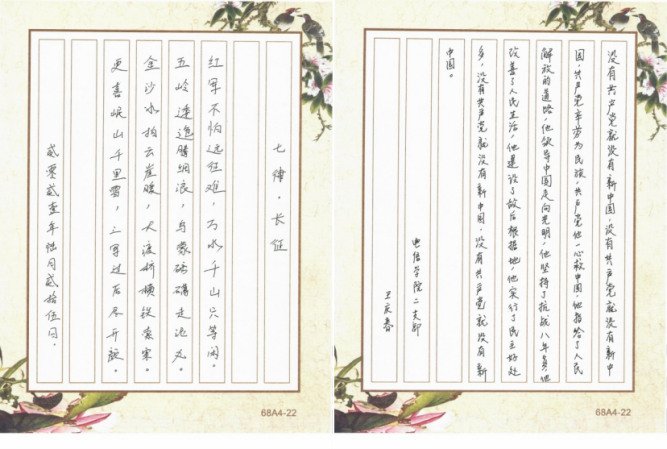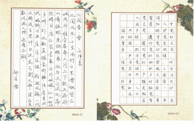 在第二阶段的“学党史硬笔书法展示”活动中,学院体教职工学习党史、手抄党史,积极展示教学基本功。在书写现场,老师们屏息凝神、运笔流畅,把对党的热爱和学习党史的热情融入到一笔一顿中,作品或刚劲有力,或潇洒飘逸,或大方得体,或秀气隽美,展现出欧冠投注官网入口教师扎实的教学基本功和昂扬向上的精神状态。
