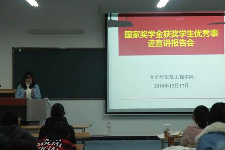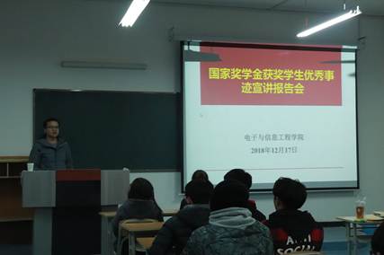 2018年12月17日晚7点30分,欧冠投注官网入口进行了国家奖学金获奖学生优秀事迹进班宣讲报告会,报告会由团总支书记陈浩老师主持,欧冠投注官网入口2018年荣获国家奖学金的王松、汪钊、黎敏三位同学作报告,欧冠投注官网入口全体大一新生参加。