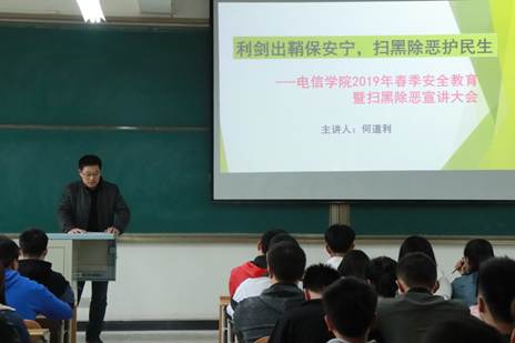 2019年3月22日下午4点,欧冠官方网站团总支于1305教室开展了2019年春季安全教育暨扫黑除恶宣讲活动。参加此次活动的有欧冠投注官网入口党总支书记何道利、团总支书记陈浩以及欧冠投注官网入口全体学生干部。