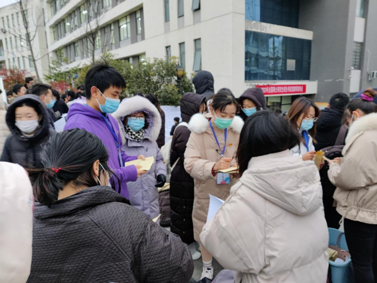 志愿服务活动中,欧冠官方网站党总支首先为全体在校考生精心准备、免费发放了一份爱心午餐,并将志愿者和考生做了一对一帮扶安排,要求志愿者和考生保持联系、随时提供帮助。12月25日、26日考试的两天中,寒风凛冽,天空中飘着雪花,在考生进考场一小时前,志愿者在一号教学楼楼梯口前,协助完成了考生的核酸检测工作。在考试期间,志愿者们集中保管了考研学生的私人物品,并且随时待命,保持手机畅通,接受由于疫情影响所引起的各类突发性工作。遇上院外或校外考生咨询信息时,志愿者给予了热情的回复帮助。
