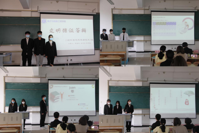 本次共有22个班级参与答辩,各班由班长、团支书及任意一名班委成员组成的三人答辩团,重点围绕组织建设、思想教育、班级特色工作、学风建设、志愿服务、社会实践与疫情防控等方面对班级及团支部工作开展情况进行介绍。同时,借助PPT讲解、视频影像及纸质版工作总结材料等,在增强班集体凝聚力、战斗力和创造力,营造良好的班级文化、学习氛围以及打造班级鲜明特色等方面多角度地对创建文明班集体进行了汇报,充分展示了班集体与班级成员在过去的一年里取得的荣誉与成就。面对各评委提问,各班级答辩人以清晰的思路,细致地回答,展现出电信学子积极向上的精神面貌。同时,评委们就具体情况对各答辩班级提出针对性建议,对各答辩班级进行指导。答辩班级认真听取建议,为今后班级建设积累重要经验。