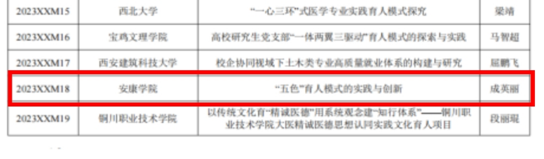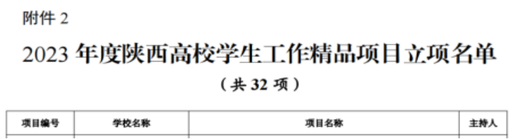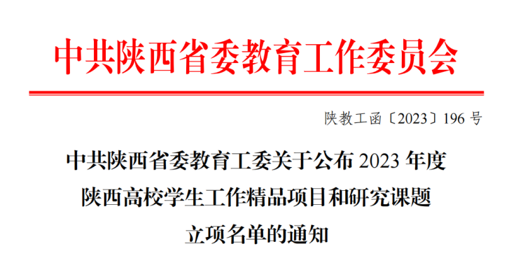 近日,中共陕西省委教育工委公布了2023年度陕西高校学生工作精品项目和研究课题立项名单,欧冠官方网站辅导员成英丽副教授主持的《“五色”育人模式的实践与创新》获批陕西高校辅导员工作精品项目立项。该项目组成员有学院党总支书记于咏梅,学工办主任石纭昊,辅导员张宇航、吕以宁和李章雨。