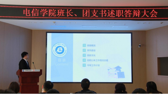班长、团支书述职答辩是电信学院进一步加强班团一体化、学生基层组织建设和学生骨干培养的重要举措,增强了班集体凝聚力和集体荣誉感,发挥优秀班集体的模范作用。此次述职答辩大会也为班团干部提供了一个展示自我的平台,各班同学相互分享、相互学习,通过整理班级问题,延伸发展思路,总结工作概况,为未来班级规划打下夯实的基础,真正做到“任其职,谋其事”,更好地为同学们服务。
