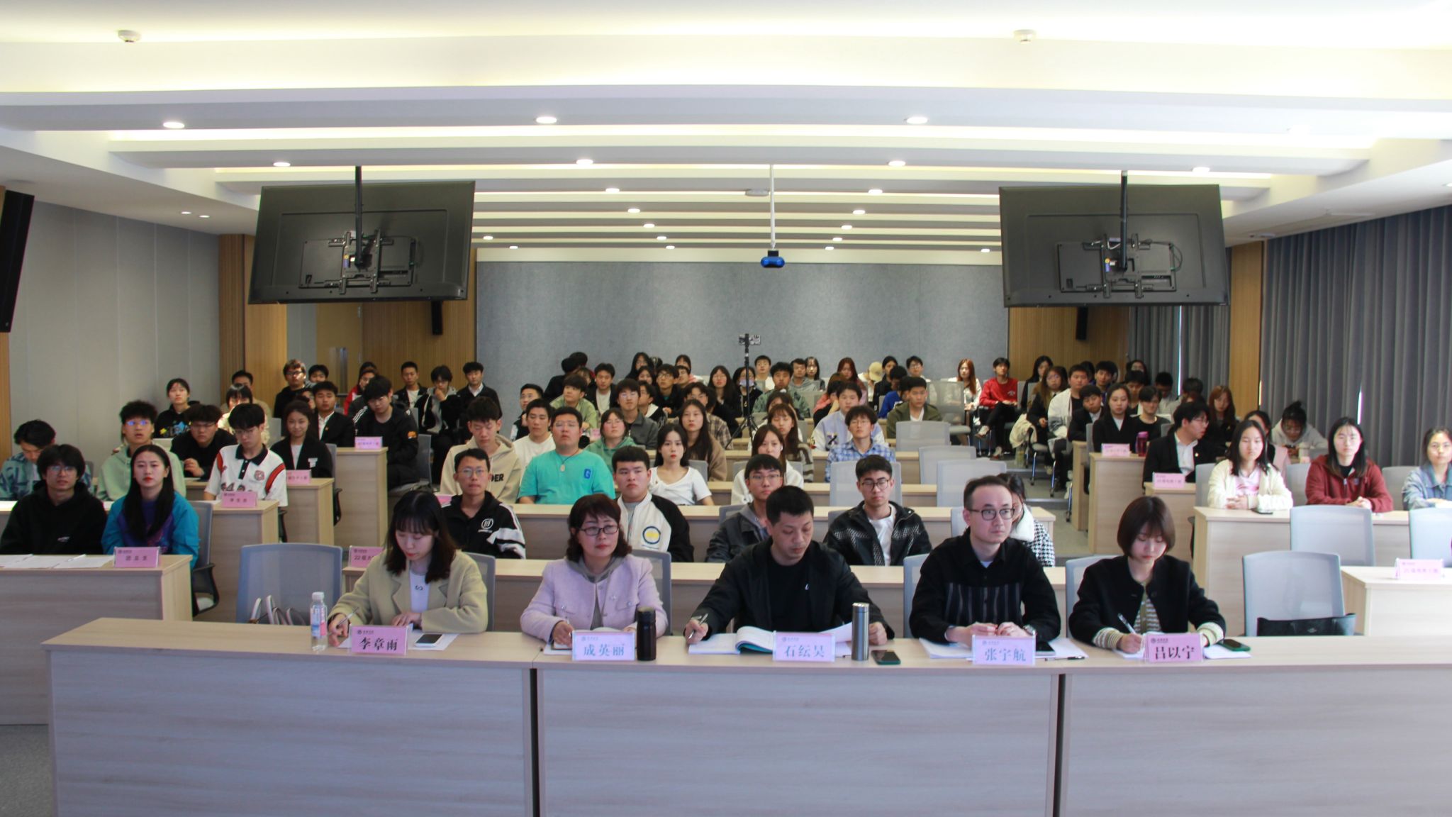 首先,由各班班长进行述职答辩。他们以PPT展示的形式分别从班级日常管理、学风建设、文体活动等方面对上学期班级取得的成绩进行汇报,并结合自身班级特点,向同学们分享了自己的工作经验,以问题为导向,总结经验、查找不足,对新学期的班级建设进行了规划。他们述职演讲图文并茂,展示了各自班级在过去一年的发展情况。