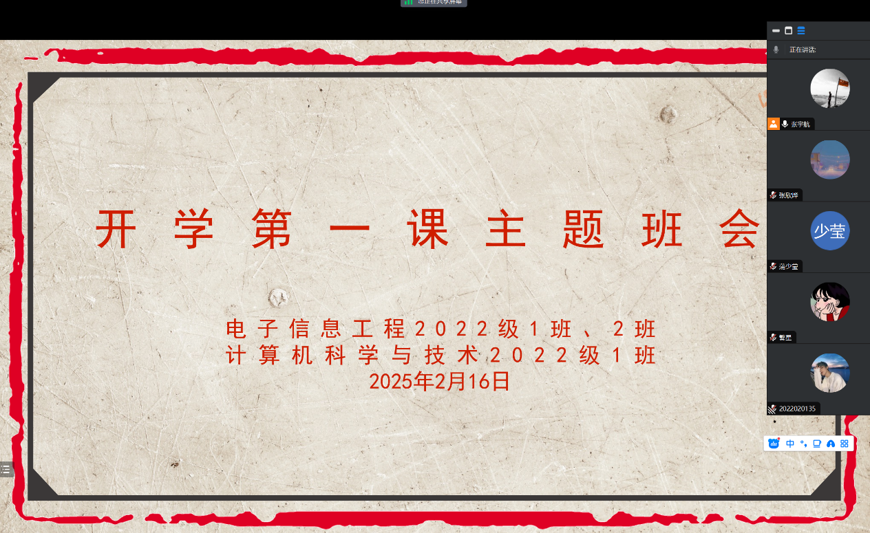 为扎实推进欧冠投注官网入口2025年春季新学期工作开好局、起好步,引导学生做好新学期规划,做好学生返校后的安全教育工作,2月16日,欧冠投注官网入口全体辅导员组织所带班级分别通过线上和线下相结合的方式召开了新学期主题班会,全体学生参会。