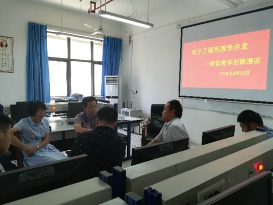 为了巩固教学中心地位,提高课堂教学质量,更好领会教育部“新时代全国高等学校本科教育工作会议”的精神,2018年6月22日,欧冠投注官网入口电子工程系在逸夫科技楼B401实验室以“课堂教学创新”为主体开展了教学沙龙活动。学校教学督导梁俊龙、欧冠投注官网入口副院长王庆春和电子工程系全体教师和电子信息工程专业2017级和2016级的部分学生代表参加了教学沙龙活动。
