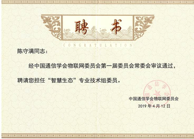 本次会议还宣布成立了中国通信学会物联网委员会“智慧生态”专业技术组,欧冠投注官网入口院长陈守满教授被聘为专家委员。