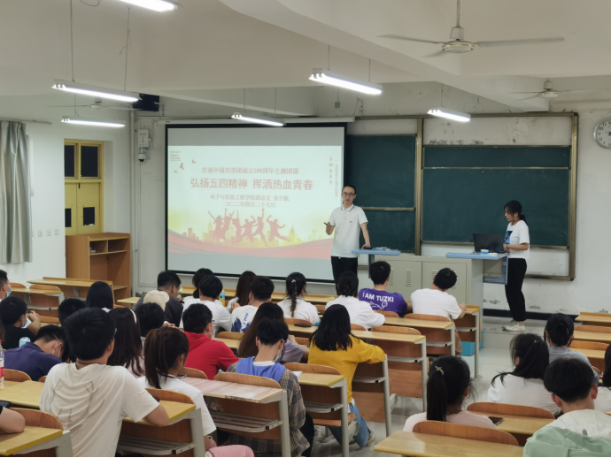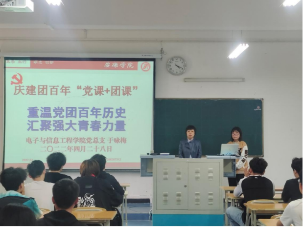 坚持党建带团建 为激发欧冠投注官网入口广大团员青年爱党、爱国情怀,实现党建带团建的目标,培养电信学子践行社会主义核心价值观,以昂扬的斗志和精神状态庆祝建团百年,迎接党的二十大胜利召开,4月28日,欧冠投注官网入口党总支书记于咏梅在1307教室以“重温党团历史,汇聚强大力量”为主题,为电信学子上了一堂生动的主题“党课+团课”。