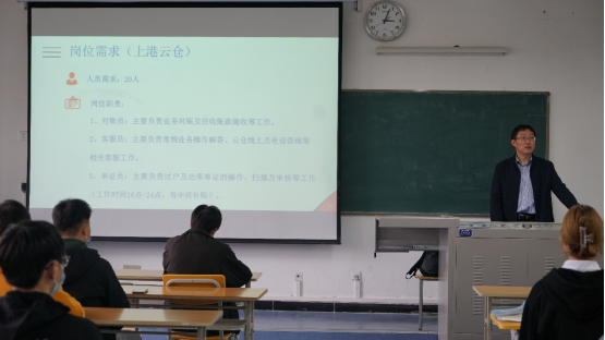 为了拓宽欧冠投注官网入口学生的就业渠道,让学生们有更多的选择机会。欧冠官方网站邀请安康上港物流有限公司于10月26日在江北校区1308教室召开了秋季招聘会。此次会议由欧冠投注官网入口学工办主任石纭昊出席,陕西国心海港供应链服务有限公司运营经理张凡主讲,欧冠投注官网入口2019级学生参加。