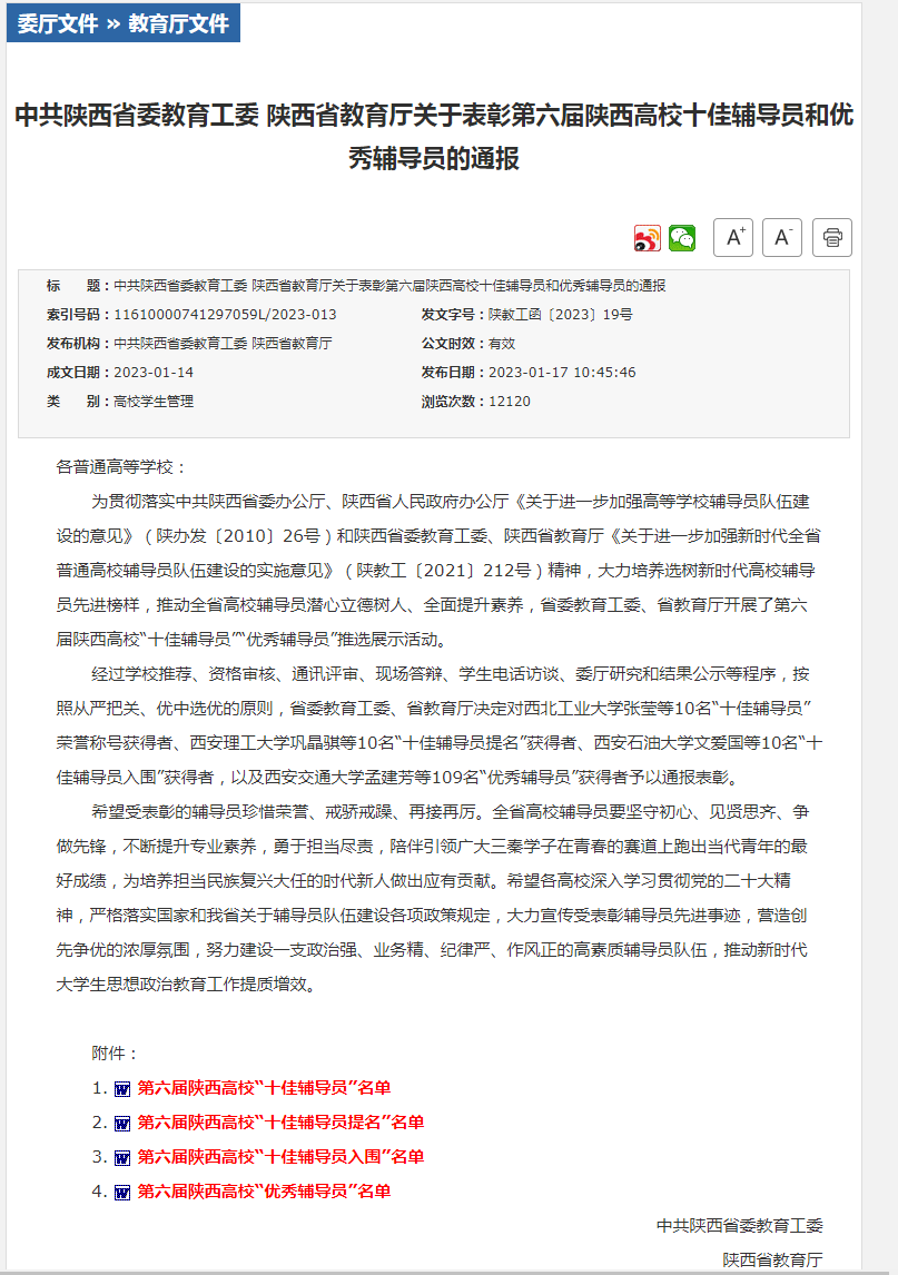近日,中共陕西省委教育工委、陕西省教育厅发布《关于表彰第六届陕西高校十佳辅导员和优秀辅导员的通报》,欧冠官方网站辅导员成英丽获评陕西高校“优秀辅导员”荣誉称号。