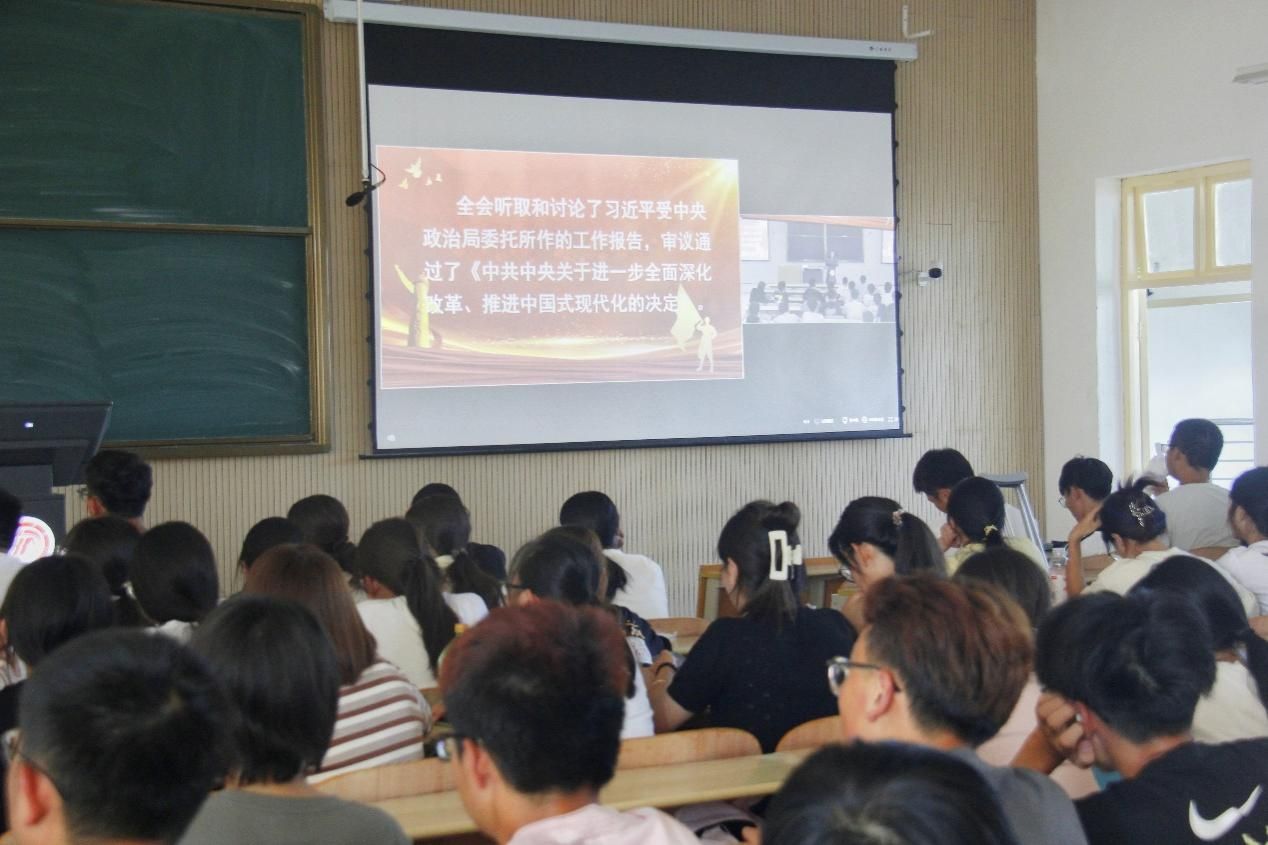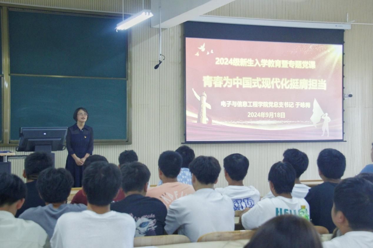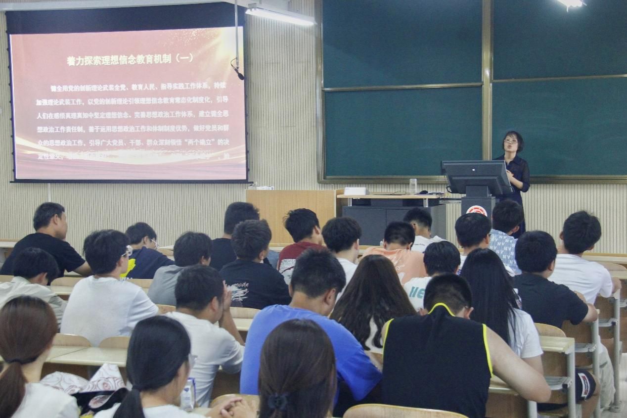 为深入学习贯彻党的二十届三中全会精神,用习近平新时代中国特色社会主义思想和习近平总书记2024年五四青年节的重要讲话武装青年大学生,坚持立德树人根本任务,以“五色”育人模式的实践与创新引领青年大学生奋力书写为中国式现代化挺膺担当的青春篇章,9月18日下午,欧冠投注官网入口党总支书记于咏梅在江北校区1301、1404教室讲授主题为青春为中国式现代化挺膺担当的专题党课暨新生入学教育,欧冠投注官网入口2024级全体新生参加。欧冠投注官网入口辅导员成英丽主持。