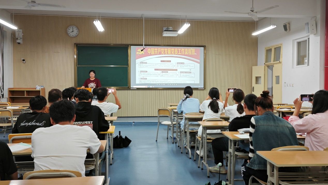 学生第一党支部书记翟子轩从“什么是中国共产党、为什么要加入中国共产党、加入中国共产党需要做什么”三个方面进行讲解,鼓励同学们要树立共产主义远大理想,坚定中国特色社会主义信念,通过对习近平新时代中国特色社会主义思想、党的路线方针政策等理论知识的学习,不断深化对党的认识。他希望同学们大学期间严格要求自己,踊跃递交入党申请书,尽快从思想上、行动上向党组织靠拢,争取早日成为一名光荣的中国共产党党员。