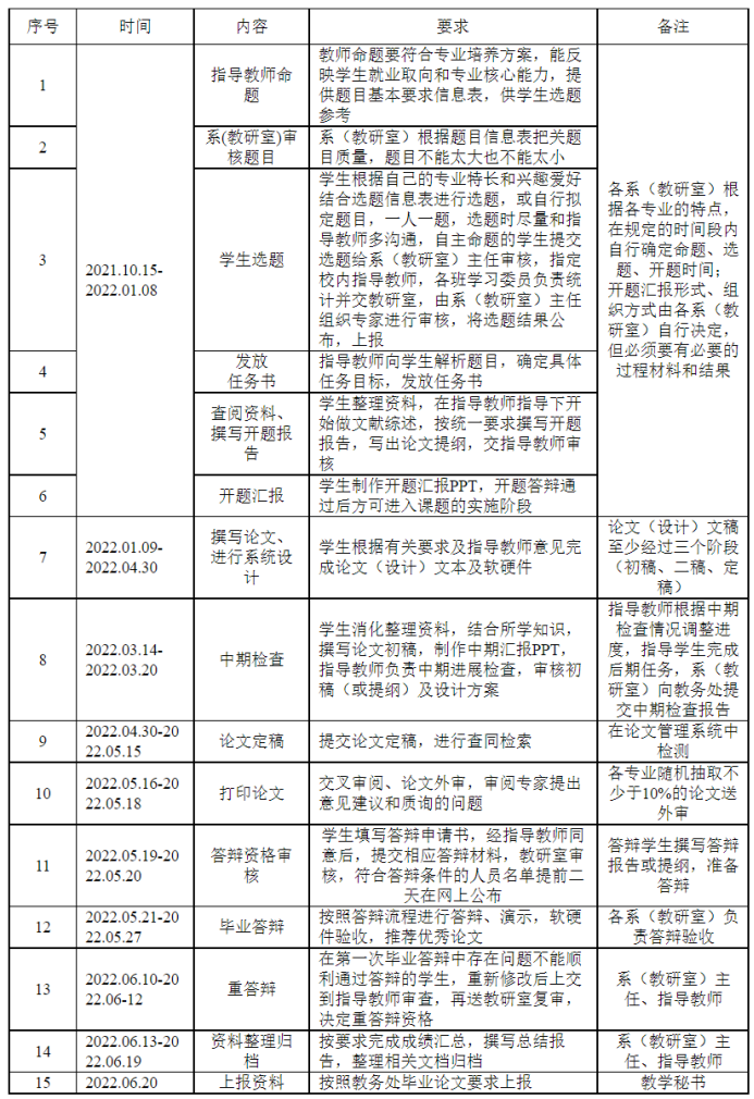 毕业论文(设计)是本科教学最重要的实践教学环节,欧冠投注官网入口2022届本科毕业论文(设计)的各项工作将在2021年10月~2022年6月期间完成,为更好地开展这一极为重要的实践环节,按照《欧冠投注官网入口本科生毕业论文工作流程》要求,现就2022届毕业论文(设计)相关工作布置如下,请各系(教研室)仔细阅读并认真执行。