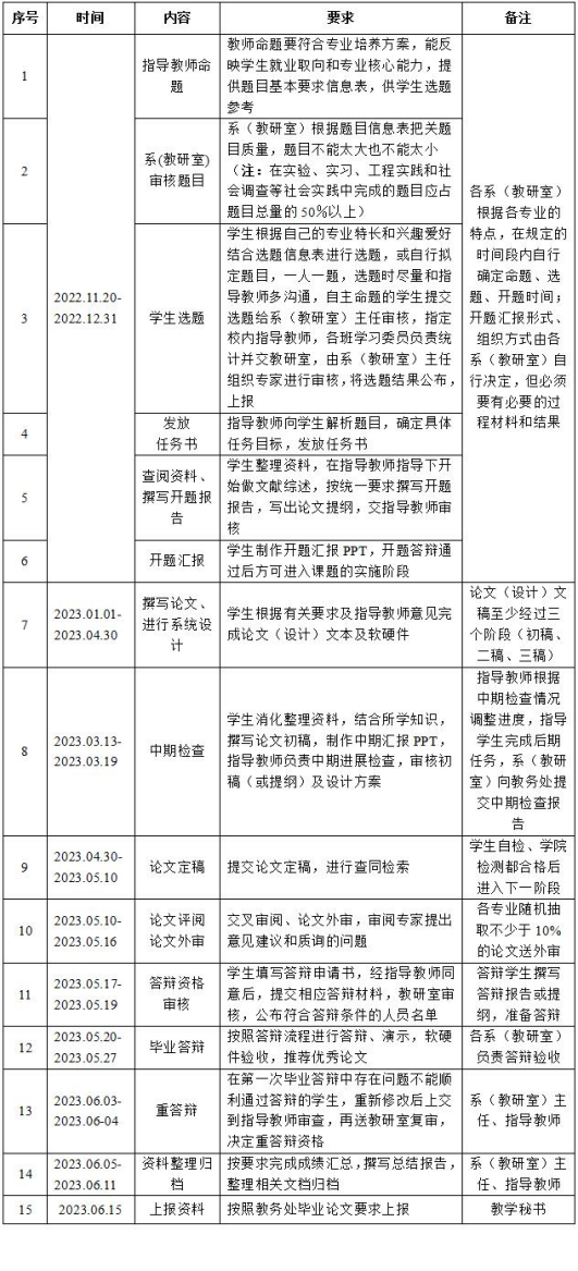 毕业论文(设计)是本科教学最重要的实践教学环节,欧冠投注官网入口2023届本科毕业论文(设计)的各项工作将在2022年11月~2023年6月期间完成,为更好地开展这一极为重要的实践环节,按照《欧冠投注官网入口本科生毕业论文工作流程》要求,现就2023届毕业论文(设计)相关工作布置如下,请各系(教研室)仔细阅读并认真执行。