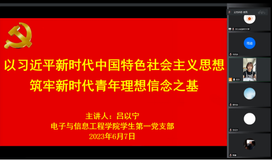 为进一步推动学习贯彻习近平新时代中国特色社会主义思想主题教育走深走实,6月7日欧冠投注官网入口学生第一党支部通过线上腾讯会议平台开展“以习近平新时代中国特色社会主义思想,筑牢新时代青年理想信念之基”主题教育党课。本次党课由学生第一党支部书记吕以宁主讲,学生第一党支部全体党员参加。