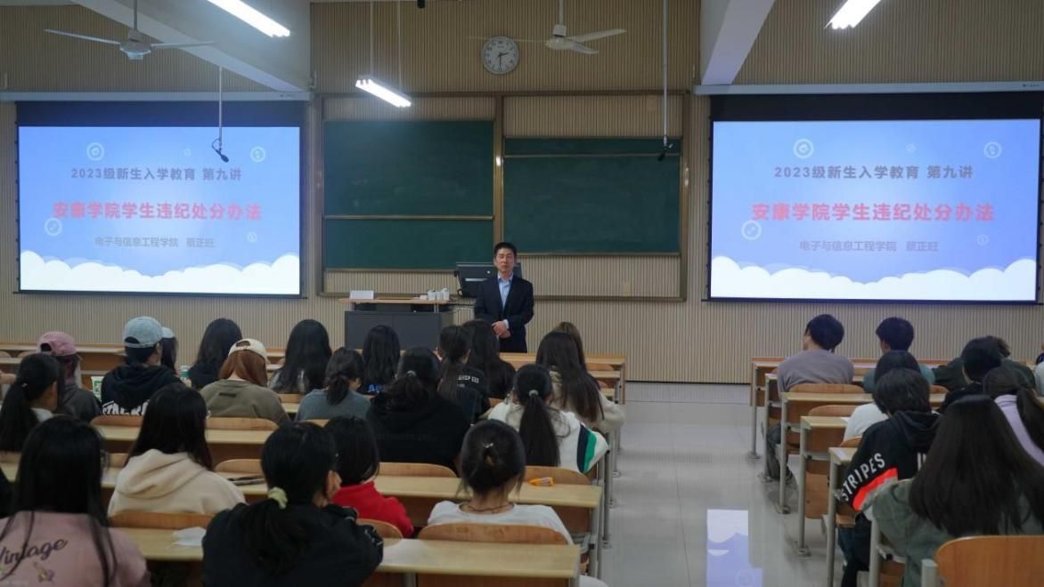为了加强新生纪律观念,规范行为习惯,严肃校风校纪,促进学生健康成长,10月18日下午,欧冠官方网站党总支副书记蔡正旺在江北校区1204教室讲授主题为“欧冠官方网站学生违纪行为处分办法”新生教育大会,欧冠投注官网入口2023级全体新生参加。