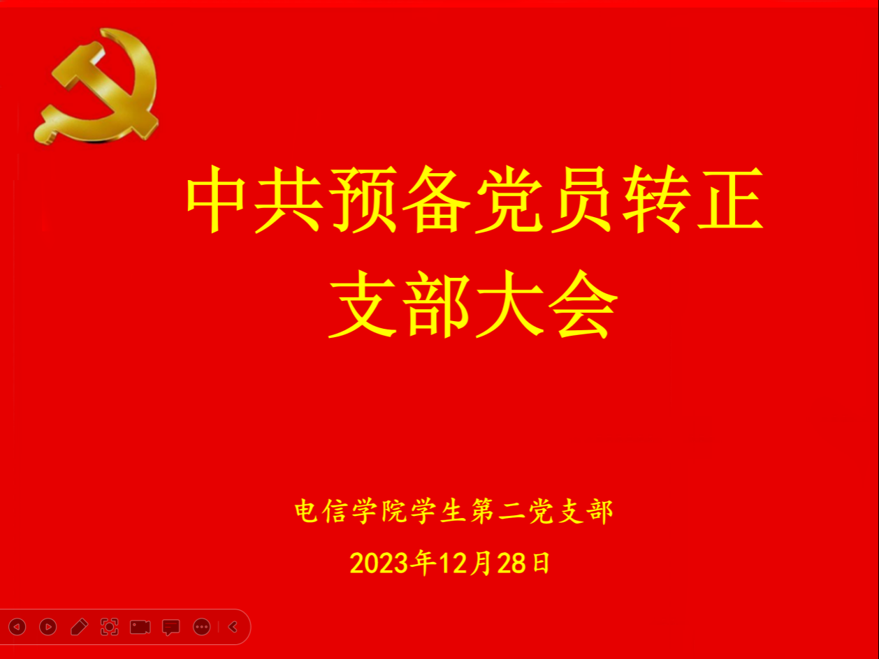 2023年12月28日晚上7点40,欧冠投注官网入口学生第二党支部采用线上腾讯会议的形式召开了中共预备党员转正党员大会,会议主要讨论了翟子轩等六名中共预备党员的转正事宜。欧冠投注官网入口学生第二党支部书记李章雨、组织(纪检)委员石纭昊,以及支部全体党员参加了本次会议。会议由李章雨主持。